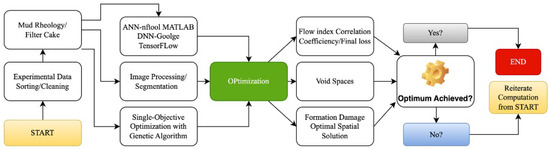 In this research framework, we demonstrated three different numerical methods to optimize the mud rheology parameters and fluid flow in filter cakes. Firstly, we organized laboratory data on mud rheology and integrated them into both the feed-forward neural network application and from Google TensorFlow open-source platform version 2.16.1. Secondly, we used MATLAB’s image processing application to analyze the mud cake or filter cake image data generated during mud filtration. Finally, a genetic algorithm for a single-objective function based on the informed experiment was modeled. These techniques aided us in determining the amount of void spaces and predicting the permeability postures of the filter cakes and the flow index of the mud rheology. Here, as shown in Figure 1, we present a detailed discussion of the framework.