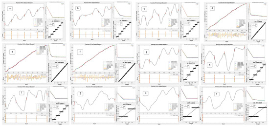 However, the relationship between layers is a deeply interconnected neuron network [62]. In this study, the artificial neural network feedforward function (ANN-FF) from MATLAB’s nftool application, a user-friendly neural network processing toolbox meant for non-programmers, used the entire data from each fluid rheological component to model and predict better responses for fluid behavior [63,64]. The model was trained using inputs such as the plastic viscosity, apparent viscosity, yield point, and gel strength (10 s and 10 min) to determine the output flow index. This model is widely seen as effective because it can extract weights and biases from the trained data and the equations used. The already pre-processed data imported used 10, 12, and 18 neurons as a means to validate the results compared with Alsabaa’s research [23]. Moreover, Figure 2a–l shows the propagation of more stable linear regression analysis by employing nftools’ non-linear hidden neurons sigmoid with a linear output neuron based on the rheological parameters. While focusing on the computational speed with less memory accessibility, ANN-FF proceeded with the Levenberg–Marquardt training algorithm and the mean square error loss function.