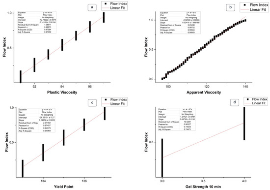 Non-ANN correlation coefficient: (a) PV, CC = 0.97359, (b) AV, CC = 0.99503, (c) YP, CC = 0.94969, and (d) GS 10 min, CC = 0.74471.