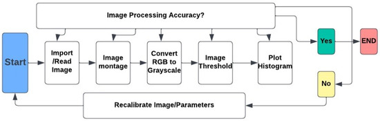 The method simply has a simplified structured algorithm, as illustrated in Figure 5, where an input of the image gives rise to the output results; some techniques were employed while processing the image [66], and some of these are the region of interest (ROI), binary operations, the neighborhood and block, linear filtering and the filter, and a geometric operation, to mention but a few. While other previous studies [50] paid attention to binary image operations and regions of interest, the current study utilized the same, focusing on the entire mud cake as the region of interest and thresholding by converting full-color image or grayscale images into binary.