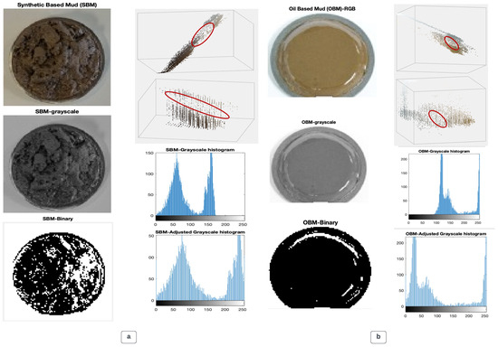 The next step after segmentation was thresholding, which involved the extraction of a partitioned image based on its intensity and properties. Further grayscale image interpretation for the current study fairly reviewed a 2D adjusted histogram of the two filter cakes, which were formulated from synthetic- and oil-based mud. The x–y axis of the histogram represents the respective intensities and amounts of pore spaces. A 3D particle distribution [73,74] and pore networks were initiated to explain how these two different mud compositions interact with permeability. Red, green, and blue (RGB) and hue saturation values (HSV) were selected for these processes. Thus, particle distribution [75] and particle suspension enhance simple visualization and expose the region of interest (ROIs); however, these processes are coined from thresholding.