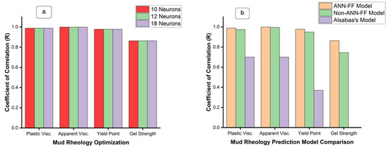 The study further conducted a comparative analysis using Alsabaa’s model and a non-ANN-FF linear fit model. The average of Alsabaa’s mud weights’ correlation coefficient (cc) and the average of the number of neurons is demonstrated in Figure 8b, which predicts the accuracy of the rheologically sensitive prediction analysis. The ANN-FF model from nftool clearly distinguishes between the best training and testing algorithms.