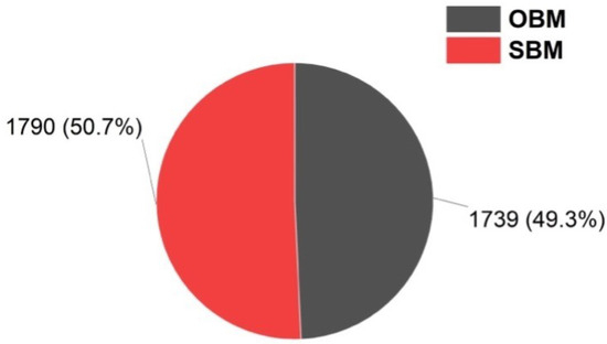 A similar segmentation algorithm for the oil-based mud (OBM) was applied; the image filter cake was imported and segmented using the embedded segmentation app, and the RGB image was converted into grayscale using the im2gray function and finally into a 2D binary image using the thresholding function. The threshold intensity of 90 used for the SBM was maintained for the OBM image processing; the color threshold exposed a 3D dispersity of particles in the OBM filter cake, as shown in Figure 6b. Notwithstanding, the entire area pixel of the filter cake was 24,846, whereas the micrometer area was 1739 M µm2. However, the analysis for this study focused on the 2D binary image and the 3D scattered particles; the binary image from Figure 6a,b explains, comparatively, that the SBM-binary had considerable amounts of white portions compared to the OBM-binary, which in effect means it had a greater tendency for increased permeability than the black portions, which tend to impede the flow [82]. Remarkably, the 3D scattered plots depict more flow accessibility for SBM than for OBM; this analysis was based on a standard thresholding intensity of 90 for both filter cakes to avoid computational biases and with the assumption that the cakes taken were of the same image quality. Figure 9 represents the area of void spaces in micrometers for SBM and OBM.