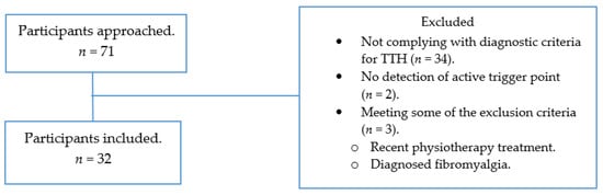 The inclusion criteria of the participants were as follows: patients were under the supervision of a specialist of neurology. Patients had to meet the criteria defined for TTH in the International Classification of Headache Disorders, third edition [4]: bilateral location, pressing and tightening pain, mild to moderate intensity, and no aggravation of pain during physical activity. Patients should report no more than one of the following symptoms: photophobia, phonophobia, or mild nausea, and no moderate or severe nausea or vomiting, as established by the ICHD-III diagnostic criteria. The sample was also required to have been suffering from TTH for more than six months, to have experienced at least one and up to 30 headache episodes per month, and to have at least one active trigger point in any of the muscles that refer pain to the head, in accordance with the diagnostics criteria and referred pain description of Travell and Simons [38]. All participants provided written informed consent prior to their inclusion in the study.