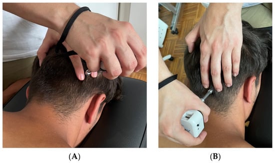 Demonstration of the assessment of pressure pain thresholds in the posterior occipitofrontal region (A) and in the semispinalis 1 (B).