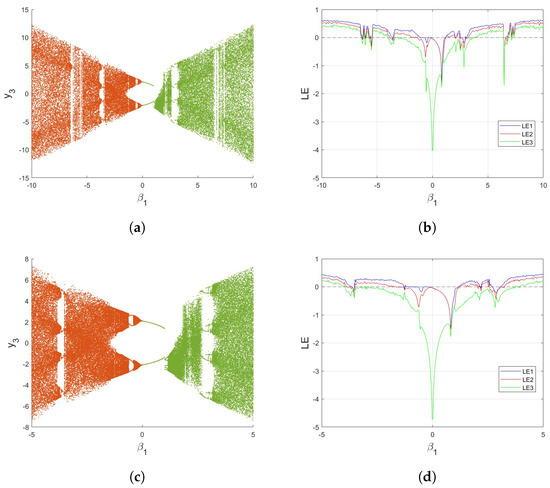 • Case 1. In Figure 1a,b, the bifurcation diagram and the associated L E s of the map (2) are plotted using MATLAB R2024a code. Considering β 1 to be the bifurcation parameter versus [ 10 , 10 ] with β 2 = 1.9 , γ = 0.5 maps the parameters and IN1 and IN2. Subsequently, a small portion of the zone proximal to the bifurcation and the associated L E s are plotted at β 1 [ 5 , 5 ] , presented in detailed view as shown in Figure 1c,d. When β 1 [ 10 , 6.899 ] [ 5.294 , 4.587 ] [ 3.912 , 0.999 ] , and β 1 [ 4.988 , 7.199 ] [ 7.9 , 10 ] , the map is chaotic with only three L E s values being positive. Additionally, when β 1 [ 6.7 , 5.295 ] [ 1.1 , 3.899 ] , β 1 [ 3.9 , 4.499 ] is hyperchaotic, where L E s shows two positive and one displaying negative values. Moreover, the symmetric map is periodic at β 1 [ 1 , 1 ] [ 4.5 , 4.987 ] , and β 1 [ 7.2 , 7.899 ] , where all L E s values are negative. The map is quasi-periodic in β 1 [ 4.588 , 4.111 ] , where one L E has zero values.