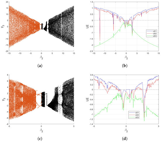 • Case 2. For β 2 versus in [ 15 , 15 ] with β 1 = 1.7 , γ = 0.5 and IN1 and IN2. The symmetric map changes the dynamics between the hyperchoas, periodic, and quasi-periodic behaviors as illustrated in Figure 2a,b. For more details on β 2 [ 5 , 5 ] , view Figure 2c,d. When β 2 [ 15 , 12.699 ] [ 12.298 , 6.3 ] , β 2 [ 5.999 , 1 ] [ 1.1 , 3.498 ] and β 2 [ 3.811 , 15 ] , the map become hyperchaotic with two positive L E s , and one negative value. It shows the periodic behavior when β 2 [ 12.5 , 12.299 ] [ 6.399 , 6 ] [ 1 , 0 ] , and β 2 [ 3.499 , 3.8 ] , where all three L E s values are negative. The presence of one zero L E and the others is negatively expressed in the progression to quasi-periodic in the interval β 2 [ 0.5 , 1 ] .