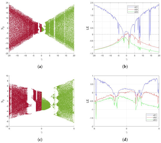 • Case 3. Similarly, take β 1 = 1.7 and β 2 = 1.9 versus γ in [ 20 , 20 ] as shown in Figure 3a, Figure 3b as well as the detailed view in Figure 3c,d with γ [ 5 , 5 ] . The chaotic behavior appears when γ [ 20 , 4.899 ] [ 4.5 , 1.989 ] [ 0 , 0.999 ] , γ [ 1.558 , 1.7 ] [ 2.599 , 4.7 ] [ 4.8 , 5.099 ] , where one of the L E is positive. Conversely, the periodic region exists when all the L E s are negative at γ [ 4.7 , 4.559 ] [ 1.990 , 1 ] [ 1 , 1.557 ] , and γ [ 7.6 , 7.79 ] [ 14.5 , 14.999 ] . When γ [ 1 , 0 ] , the map has a quasi-periodic attractor characterized by one L E equal to zero. Thus, γ [ 5.1 , 7.5 ] [ 7.8 , 14.499 ] [ 15 , 20 ] becomes chaotic again. According to these results, the characteristic of symmetry in the behaviors’ evolution becomes observable, reappearing over a wide field of the parameters’ systems. In contrast, symmetry breaking also occurs within a small scope.