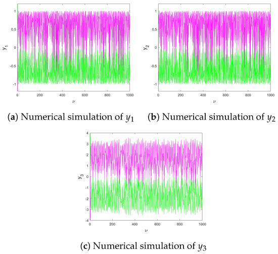 We obtain y 3 ( ν ) ( β 1 + β 2 γ ) sin ( y 3 ( ν ) ) = 0 , and thus, the map (2) has an ( 0 , 0 , 0 ) fixed point for all ( β 1 , β 2 , γ ) R 3 . Clearly, the stability analysis also depends on the parameters of the systems.