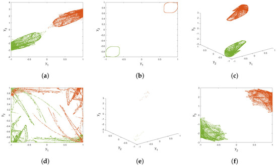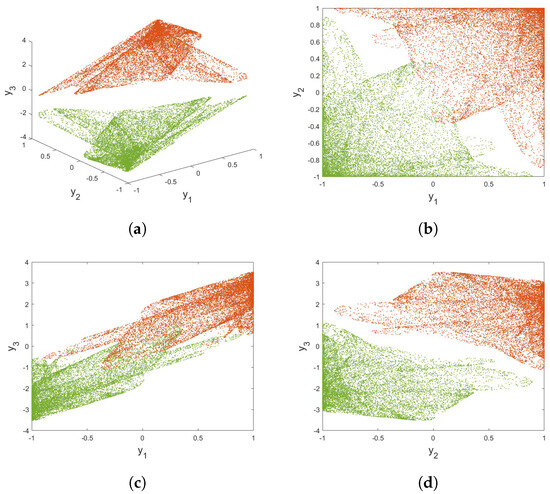 The map (2) is symmetric due to the transformation with the following standard method H : ( Y 1 , Y 2 , Y 3 ) ( Y 1 , Y 2 , Y 3 ) . Here, β 1 , β 2 , γ is the bifurcation parameter. y 1 , y 2 and y 3 are the state variables. Therefore, every attractor of (2) will show in mutually similar pairs with sensitivity to the initial conditions. Symmetry and asymmetry are advantages of dynamic analysis. For this purpose, two initial states are chosen as I N 1 = ( 0.8 , 2 , 0 ) , I N 2 = ( 0.8 , 2 , 0 ) .