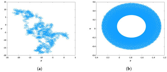 In Figure 7, the p q plots for chaotic and balanced dynamics of the chaotic symmetry map are explained for various values of the system parameters. When ( β 1 , β 2 , γ ) = ( 1.7 , 1.9 , 0.5 ) , Figure 7a illustrates the Brownian-like trajectories, which imply that the symmetry map is chaotic. As another example, Figure 7b shows bounded-like trajectories when ( β 1 , β 2 , γ ) = ( 0.8 , 0.01 , 0.5 ) , which confirms that the symmetry map is periodic. As a result, the 0-1 test findings are clearly in agreement with ( L E s ) and bifurcation.