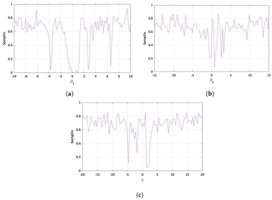 Figure 8. SampEn of symmetric map (2) for, (a) versus β 1 in [ 10 , 10 ] , (b) versus β 2 in [ 15 , 15 ] , (c) versus γ in [ 20 , 20 ] .