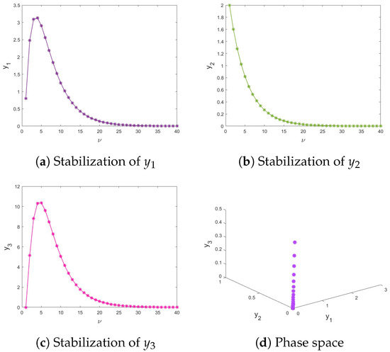 Now, the stability of the fixed points of the map (2) is analyzed, so the fixed points will be discovered by y 1 ( ν + 1 ) = y 1 ( ν ) , y 2 ( ν + 1 ) = y 2 ( ν ) , y 3 ( ν + 1 ) = y 3 ( ν ) as follows: