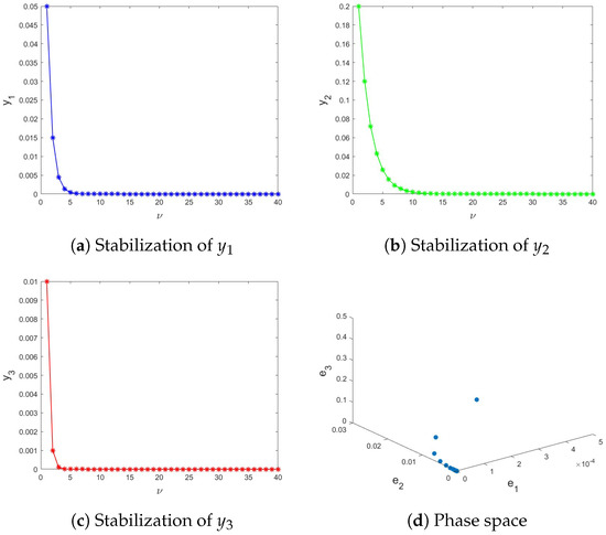 To validate the results of Proposition 2, Figure 9 indicate the states evolution and phase space of (13), where ( ξ 1 , ξ 2 , ξ 3 ) = ( 0.6 , 0.8 , 0.3 ) and the initial values IN2. Clearly, from the figure, the states of the controlled symmetric map (13) converge toward zero asymptotically.