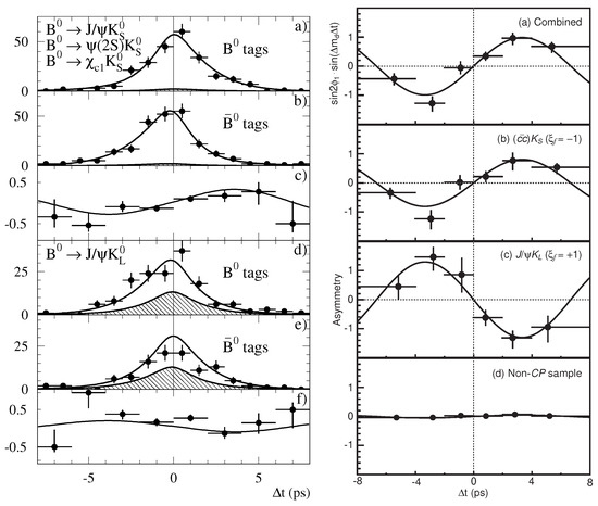 First observation of CP violation in B0 decays as obtained by the BaBar (left) [9] and Belle (right) [10] collaborations. In the left plots, the cumulative decay time distributions of B mesons decaying to , , and are shown when identified as B0 mesons (a) and mesons (b). A shaded area represents the contribution of background events. The asymmetry in the decay time distributions of the signal candidates, which is a measure of CP violation, is shown in (c). Similar plots are made for decays in (d–f). In the right plots, (a) shows the asymmetry in the decay time distributions of B mesons decaying to , , , , and , which is separated for B mesons decaying to final states (b) and final states (c), and (d) shows the asymmetry of the control samples. The black dots in the plots represent the data, while the solid lines represent the fit to the data. Shaded area represent the contribution of background events.