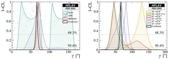 where the first set of values (Equation (8)) are measured by the BaBar experiment [13], and the second (Equation (9)) by Belle [14]. These results represents the legacy of the B Factories and were quite recently superseded by the LHCb experiment [15], whose latest measurement of this parameter is