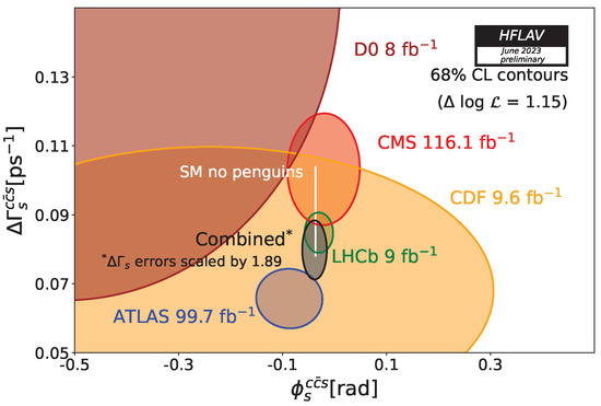 The specific topology of the decay allows to measure with good precision at hadron colliders. The and resonances have very small widths, which makes their identification easier even without a specific particle identification sub-system. Therefore, many experiments have measured the parameter using this decay mode [51,52,53,54,55]. The latest combination of these measurements is shown in Figure 5. As shown in the figure, the combination of the independent measurements from different experiments is consistent with the SM prediction.