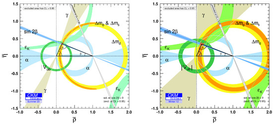 - Charles, J.; Deschamps, O.; Descotes-Genon, S.; Lacker, H.; Menzel, A.; Monteil, S.; Niess, V.; Ocariz, J.; Orloff, J.; Perez, A.; et al. Current status of the Standard Model CKM fit and constraints on ΔF = 2 New Physics. Phys. Rev. D 2015, 91, 073007. [Google Scholar] [CrossRef]