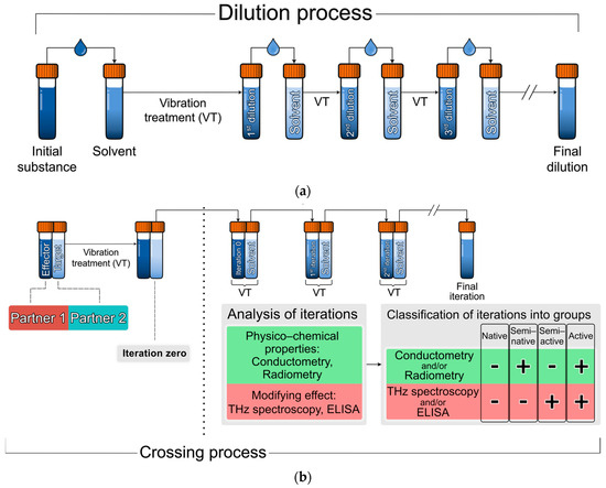 Relatively recently, it was discovered that ME can be exerted without the direct contact (contactless) of high dilutions of antibodies with the corresponding antigen or neutral medium by placing vials with high dilutions and the target molecule adjacent or at a close distance (from 1 to 3 cm) from each other [36,37,38,39]. The ability of highly diluted substances subjected to vibration to have contactless interactions with their targets suggested that behind the screen of multiple dilutions there is a contactless interaction between the substance (the conditional effector) and the solvent (at the first stage of high dilution preparation) and then dilutions of the substance and the solvent (at subsequent stages) (Figure 1a). Probably, the processes of the dissolution of the initial substance in the solvent and the non-contact interaction of the substance and the solvent are interdependent processes.