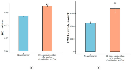 Based on the previously obtained data [31], as well as information about the ability of vibration-treated high dilutions of antibodies to emit electromagnetic waves in the frequency range of 50 MHz–3.5 GHz [37,40], radiometry was used to study iterations. Samples that differed from the neutral carrier were designated as ‘GHz+’, and those that did not differ, as ‘GHz−’.