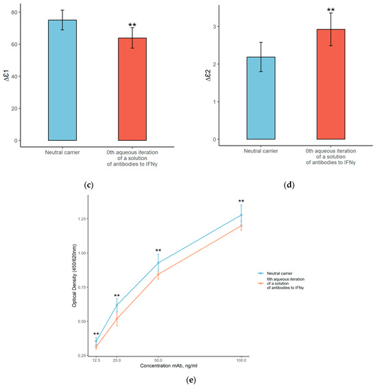 It was also previously shown that after vibration treatment, high dilutions of antibodies to IFNγ are capable of changing the THz characteristics of IFNγ solution [36], and, therefore, a change in the THz characteristics was chosen as one of the markers of ME. To detect the ME of iterations, we used the Δε1 and Δε2 characteristics of THz spectroscopy, which reflect the dynamics and connectivity of water molecules, as well as the number of free water molecules in the solution, respectively. We designated samples that differed from the neutral carrier in THz spectroscopy as ‘THz+’, and those that did not differ as ‘THz−’.