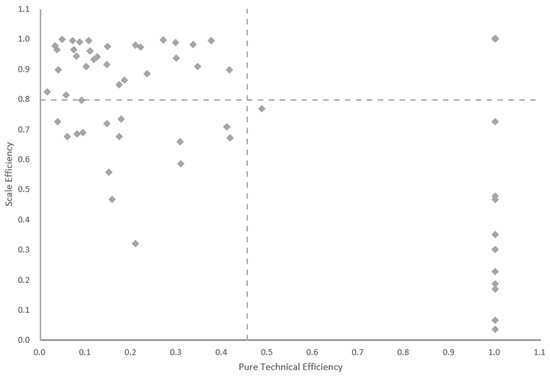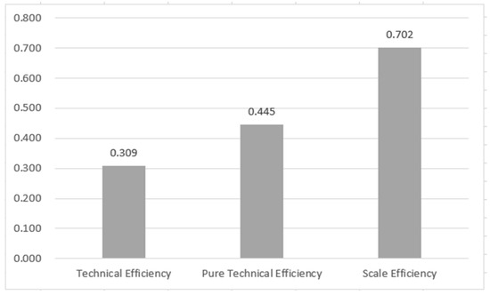 The efficiency value of the evaluated DMU is denoted by . Technical efficiency (TE) is determined under the assumption of constant returns to scale (CRS), while pure technical efficiency (PTE) is calculated assuming variable returns to scale (VRS). Scale efficiency (SE) is calculated as the ratio of TE to PTE (SE = TE/PTE).