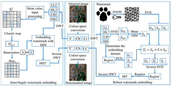 Semi-fragile watermarking combines robust and fragile watermarking traits. It can tolerate a certain degree of image processing (compression, noise and filtering, etc.), while effectively detecting maliciously tampered areas in the image [14]. Given the sensitivity of the application of remote sensing images, it is essential to guarantee their integrity and reliability during usage. The current remote sensing image watermarking algorithms generally only address single security issues. For example, Hua et al. [15] embedded a robust watermark in the DWT transform domain by selecting the region with the maximum entropy value. This algorithm only addresses the issue of copyright verification but does not consider the impact of tampering on the image. Zhang et al. [16] used Zernike moments to extract global texture features and employed Accelerated Segment Test feature points for local feature construction. Finally, they combined multiple features to identify tampered areas. However, this algorithm only achieves tamper detection. Heidari et al. [12] embedded the watermark into the host image using a combination of DWT and SVD, similarly focusing solely on copyright issues and neglecting tamper detection. These algorithms can no longer meet practical application requirements. Therefore, this study proposes a novel dual watermarking algorithm that effectively integrates both robustness and semi-fragility. The robust watermark withstands complex image operations and verifies copyright, while the semi-fragile watermark precisely identifies tampering operations for integrity verification.