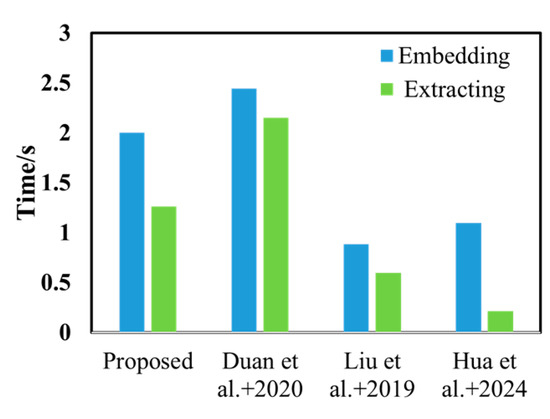 Remote sensing images contain massive surface information, and the data size is much larger than ordinary images. Therefore, the impact of algorithm complexity on efficiency must be considered during the use of watermarking algorithms. This study records the embedding and extracting time of each algorithm, as shown in Figure 6. It can be seen that the algorithm in [35] takes the longest time for both embedding and extraction. This is because the algorithm not only embeds robust watermarks in the R and G bands but also embeds fragile watermarks in the B band. In contrast, the watermarking algorithms in references [15,36] only embed a single robust watermark, making their algorithm efficiency significantly better than that of the proposed algorithm and that in reference [35]. The proposed algorithm embeds a dual watermark, and although its time efficiency is not as good as that of the single watermark algorithms, the invisibility experiment in Section 5.3 shows that the proposed algorithm has excellent invisibility, so the time consumption is worthwhile.