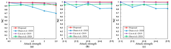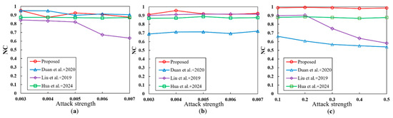 The results of a filtering attack. (a) Gaussian filtering; (b) mean filtering; (c) median filtering. Duan et al.+2022 is reference [35]; Liu et al.+2019 is reference [36]; Hua et al.+2024 is reference [15].