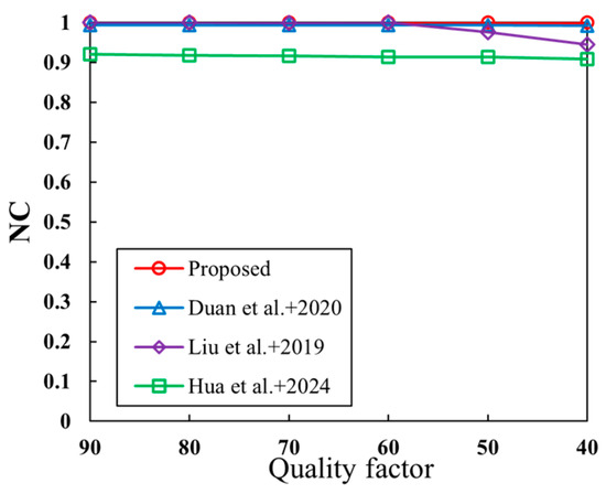 The results indicate that the proposed algorithm achieved the most stable watermark extraction results. The 4 × 4 blocking strategy used in this study allows for the extraction of complete watermark information, as long as the cropping attack does not destroy all the blocking regions. In contrast, refs. [35,36] transform the entire image and use it as the embedding domain. Therefore, if the cropping ratio is too large or if the cropping includes regions containing the watermark, the extraction effectiveness of the watermark is compromised.