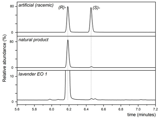 The chiral analysis using GC-MS revealed small differences in the enantiomeric ratios of OcAc in the lavender essential oils. Enantiomeric separation of racemic and natural OcAc compared with lavender EO 1 is shown in Figure 1. The results are shown in Table 3.