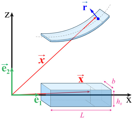 An initially straight beam of which length, thickness and width are , and is considered. A fixed Cartesian coordinate system with basis vectors is located in the neutral surface of the beam, as displayed in Figure 1.