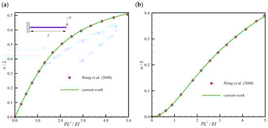 In this example, deflection of a clamped-free beam under a tip force is studied. As shown in the Figure 2a, a cantilever with length is applied to the point force at the free end. The load is so that the load parameter goes to 5, where is the elasticity modulus and is the moment of inertia. Our convergence analysis shows that a mesh of ten elements is enough to get converged results. The deformation-force curves are depicted in Figure 2a,b. It is deduced that, the result for vertical deflection ratio and horizontal deflection ratio in terms of load parameter are in