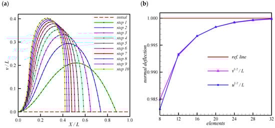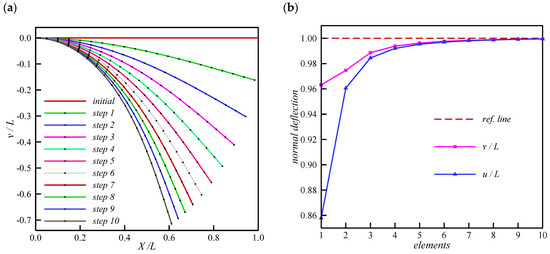 Very good agreement with the results reported in Wang et al. [33]. Moreover, the deformed shapes of the beam in ten load steps are displayed in Figure 3a. Besides, the convergence plot is shown in Figure 3b.