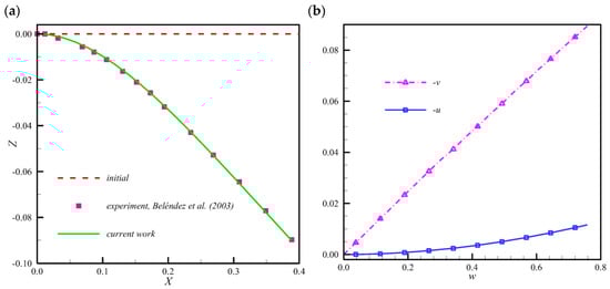 In the final example, verification of the present model with experimental results is performed. To do so, the experiment done by Beléndez et al. [34] is considered. According to their experiment, a cantilever of which dimensions are , and are considered. The cantilever is under its own weight which is equal to distributed load . Convergence analysis shows that a mesh of 5 elements is sufficient for solving this problem. The deformed shape in of the beam is depicted in Figure 6a. As can be observed, the final shape of the simulation in the present work is coincident with the final deformed shape of the experiment reported in [34]. This proves that the present model can predict the experimental results very good. Moreover, the curves of deformations in terms of loading are shown in Figure 6b.