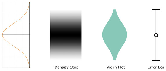 - Density strips: A density strip is a shaded band in which the depth of shading at any given point indicates the probability density of a continuous variable or an estimated parameter. The visual characteristic of ambiguity inherent in density strips is considered to convey probability more naturally. First, density strips visually emphasize the continuity of probability density, avoiding the potential for misinterpretation of confidence intervals as binary ‘in or out’ thresholds. By examining gradients and color intensities, density strips aid in understanding the regional imagery of probability density functions [36]. Furthermore, they offer considerable flexibility in use, functioning both as descriptive tools and inferential devices for hypothesis testing or confidence intervals [65]. Several studies have employed density strips or similar fuzzy visualizations for expressing uncertainty probabilities, such as visualizing observational data with point estimates sized by sample, providing uncertainty analogies based on user priors, and predictive posterior visualizations [66]. When presenting estimates of expected mileage with diffused color density strips, drivers reported improved driving experiences and reduced anxiety, maintaining trust in the vehicle [67]. Using density strips to provide the overall distribution of clinical measurements offers a more comprehensive view for descriptive visualization and inferential estimation [65].
