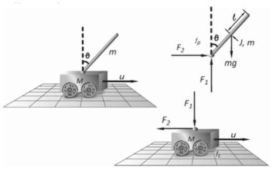 where , represents the displacement of the cart, denotes the horizontal position, indicates the vertical position, m/s2 is the acceleration of gravity, is the mass of the cart, kg shows the mass of the pendulum, means the coefficient of friction of the trolley, is the frictional resistance factor of the pendulum, m is the length from the centre of the pendulum to its axis, kg · m2 represents the inertia of the pendulum rotating around the centre, is the external force acting on the cart, and represent the action and reaction forces between the cart and the pendulum, which are equal in value and opposite in direction.