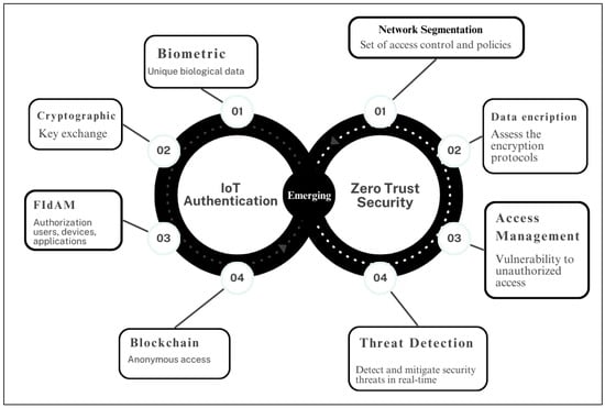 Thus, zero trust integrates the highest level of security into devices and assets, protecting against external threats. The elements of authentication offer enhanced security for data and resources against intrusions; access segmentation prevents malware and attackers; and DDoS attacks are thwarted before they can damage resources. This approach allows for more granular access control; suspicious activity and attacks can be identified and mitigated more swiftly. Furthermore, traditional authentication methods in IoT ecosystems are now being reevaluated for the integration of authentication technologies with zero trust security in the IoT, including device-to-device (D2D), device-to-gateway, multi-factor authentication (MFA) [9], and so forth.