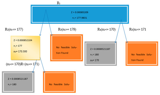 Since n1 and n2 are required to be integers, problem R1 is further branched into sub-problems R2, R3, R4, and R5 with additional constraints of n1 ≤ 237, n1 ≥ 238, n2 ≤ 176, and n2 ≥ 177, respectively. Problem R4 is resolved optimally as the solutions for n1 and n2 are integers. Problem R2 is further divided into sub-problems R6 and R7 with constraints n2 ≤ 176 and n2 ≥ 177, respectively. R6 is resolved optimally, while R7 has no feasible solution. The optimal solution is n1 = 240 and n2 = 176, minimizing V () = 0.000796088. Assuming V () = Z, the various nodes for the NLPP using case II are shown in Figure 2.