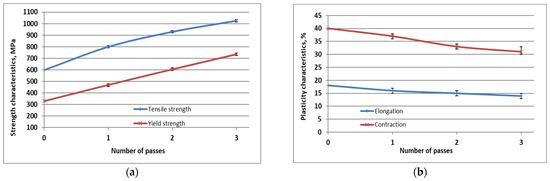 - After three cycles of deformation in the surface zone, the ultimate strength increased by 70%, and the yield strength increased by 123%. Relative reduction and elongation decreased by 22%. Despite a decrease in plasticity, its values remain at a relatively high level.