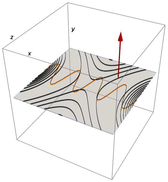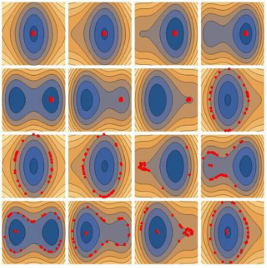 Note that H and depend just upon the single x spatial coordinate. Had we accounted for the reconnecting component of the magnetic field, the system would have been fully three-dimensional. The Hamiltonian (5) has been extensively studied in the cited literature [6,7,8,9,10,11,12,13,14,15,16,17,18,19]. Since the Hamiltonian features a time dependence that is slow compared to the cyclotron motion (in our dimensionless units, ), one might naively conjecture that the corresponding dynamics are always adiabatic and reversible, i.e., if the wave is turned on for some time, and then switched off, the initial and final particle energy are the same. The literature cited above shows, instead, that this is true only for small wave amplitudes; there is a transition from adiabatic to non-adiabatic dynamics in correspondence of a trespassing the threshold . This condition corresponds to the appearance of a slow (moving with the wave frequency) separatrix in the particle phase space. In the static case (), the separatrix divides orbits into totally disjointed basins while, in the dynamical regime, it is permeable. Close to the separatrix, the period of the orbit becomes very large, exceeding the wave period. Thus, the adiabaticity hypothesis, which relies upon the particle orbit period being much smaller than the wave period, breaks down; any crossing of the separatrix is an essentially irreversible process. Since the separatrix is an iso-energy curve in the phase space, each crossing corresponds to moving between disjointed basins at different energies: the initial and final particle energies are different. Therefore, a net energy transfer between particle and wave may effectively take place. (The threshold condition places a constraint upon the wave amplitude which is often difficult to satisfy in laboratory (and sometimes also astrophysical) plasmas, where fluctuations are ordinarily small with respect to the mean fields. Although it is not relevant to the present work, we mention that recently, we showed that this threshold is not always needed, since under some conditions it can be traded for a threshold upon the duration of the wave–particle interaction, in a way reminiscent of quantum-mechanics indeterminacy relations: see the paper [20]). This result is made visual in Figure 2: each of the 16 subplots is a snapshot of the instantaneous state of the system in the plane taken at consecutive time intervals , from left to right and from top to bottom. The colored contour levels label the instantaneous iso-energy curves constant. The red dots mark the position of 30 particles initialized close to each other near the origin (left-top subplot). While time evolves, the particles spread along almost iso-energy curves but, ultimately, a fraction of them crosses the newborn separatrix (third row) and remains energetically separated from the others.
