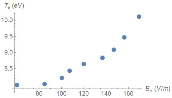 The main result of this work is summarized in Figure 3. The threshold amplitude of Equation (6) corresponds to 85 V/m for the parameters employed. There is energy gain by the electrons only beyond this threshold: compare the two leftmost points with the others. The figure should be compared with Figure 4 of the paper [4], in particular, with the red dots that correspond to the case with the largest guide field, closest to the geometry employed in the present work; there, the electron temperature rises from slightly more than 7 eV to about 10 eV over the range 50–150 V/m, nicely consistent with our result.