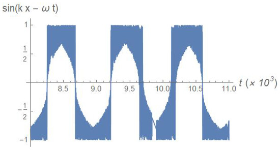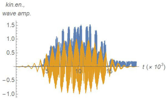 In order to give an insight about the typical dynamics experienced by the electrons during their interaction with the wave, we plot in Figure 4 a sample of the time trace of the electron’s kinetic energy, , alongside the corresponding time trace of the wave as experienced by the particle: . In particular, we pay attention to the wild energy fluctuations during the time interval t = 5000–15,000, when . They greatly exceed the final stationary energy of the particle, but only transiently; in the sub-threshold case, ultimately, the electron lands back to its initial energy once the wave has disappeared.