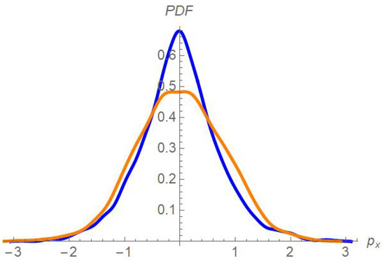 Probability distribution of the initial (blue) and final (orange) momentum distribution for the case with V/m, computed over 2400 independent trajectories.