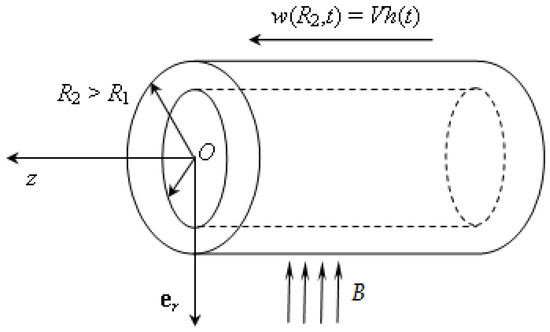 After the moment , the outer cylinder begins to slide along its axis with the time-dependent velocity , and a magnetic field of constant strength B acts perpendicular on the flow direction [33,34]. Here, V is a constant velocity, and the piecewise continuous function has its zero value in . The fluid begins to move, and the corresponding velocity vector w has the form [33,34]