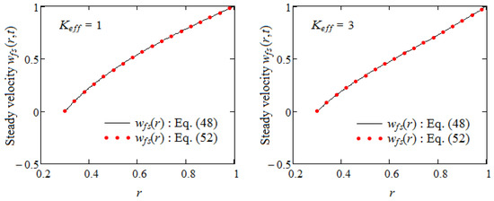 The equivalence of the expressions of the dimensionless steady velocity given by Equations (48) and (52) when and or 3.