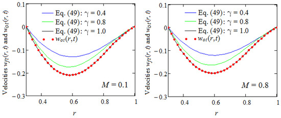 In conclusion, since the function h( ) from our solutions is arbitrary, the MHD motion problem of ordinary and fractional ECIOBF flows through a porous medium between two infinite horizontal coaxial circular cylinders is completely solved when the inner cylinder is stationary and the outer one moves along its axis. To illustrate, as well as to bring to light the influence of a magnetic field and porous medium on the fluid’s motion, in the next section, we shall consider the following particular cases: the outer cylinder moving along its axis with a constant velocity V and an exponential velocity . In the first case, the motion of ordinary ECIOBFs becomes steady over time. We shall show that the same motion of fractional ECIOBFs also becomes steady over time and that the respective dimensionless steady velocity fields and of the two models are identical.