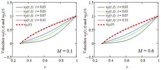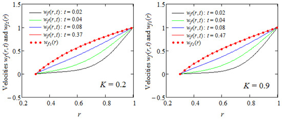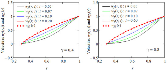 In practice, a very important problem for experimental researchers regarding the unsteady motion of fluids that become steady over time is knowing the time they take to reach a steady state. From a mathematical point of view, this is the time after which the profiles of their starting velocities superpose with those of their steady components. This dimensionless time is presented graphically in Figure 4, Figure 5 and Figure 6 for the unsteady flow of fractional ECIOBFs, induced by an outer cylinder that slides along its symmetry axis with a constant velocity V. Figure 4 shows the convergence of the dimensionless starting velocity given in Equation (47) to its steady component for fixed physical parameter values and increasing values of time t for two distinct values of the fractional parameter . In this figure, it is clear that the time required to reach a steady state increases for increasing values of . Consequently, the steady state is reached later for the flow of ordinary ECIOBFs compared with that of fractional fluids. Moreover, as expected, the fluid’s velocity is an increasing function with respect to time t, and its boundary conditions are clearly satisfied.