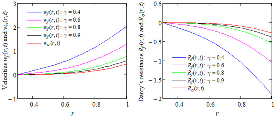 By introducing the expressions and from Equations (41) and (42) into (38), one finds, as was to be expected, the same expression for the function as that in Equation (36). This could be a proof of the correctness of our solutions. The shear stress and Darcy’s resistance corresponding to the flows of ordinary ECIOBFs are obtained by substituting the expression of from Equation (37) into (33) and (34), respectively.