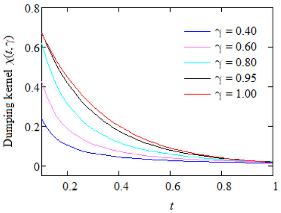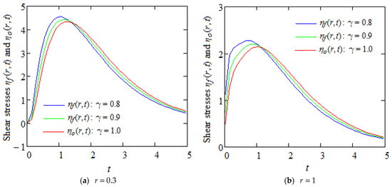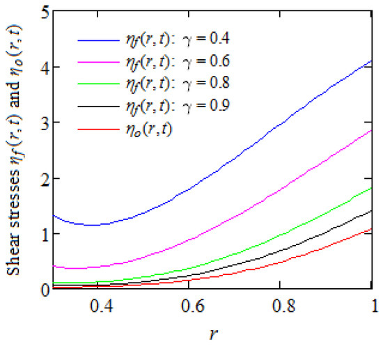 - At small values of time t, the kernel increases with the fractional parameter. It follows that for small values of the fractional parameter, a weaker damping of the velocity gradient is achieved, and the shear stress values are therefore higher (see Figure 8).